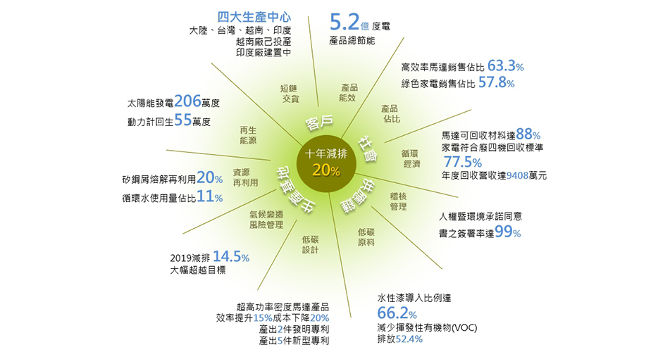 由于全球暖化,溫室效應(yīng)已對(duì)全人類產(chǎn)生沖擊,東元以「節(jié)能、減排、智能、自動(dòng)」的愿景領(lǐng)先「國(guó)家溫室氣體減量目標(biāo)」,從原料供應(yīng)鏈、高效率產(chǎn)品設(shè)計(jì)及生產(chǎn)制程進(jìn)一步檢視、監(jiān)控,期能由內(nèi)而外,由上而下,達(dá)到整體產(chǎn)品生命周期及供應(yīng)鏈綠化之目標(biāo)。針對(duì)管理方式及目標(biāo),東元宣示「十年減排20%」,基準(zhǔn)年設(shè)定為2015,目標(biāo)在2025年時(shí)降低20%的碳排放,比國(guó)家目標(biāo)高出兩倍,直追歐盟2050年零排放水平,維持國(guó)際級(jí)競(jìng)爭(zhēng)力